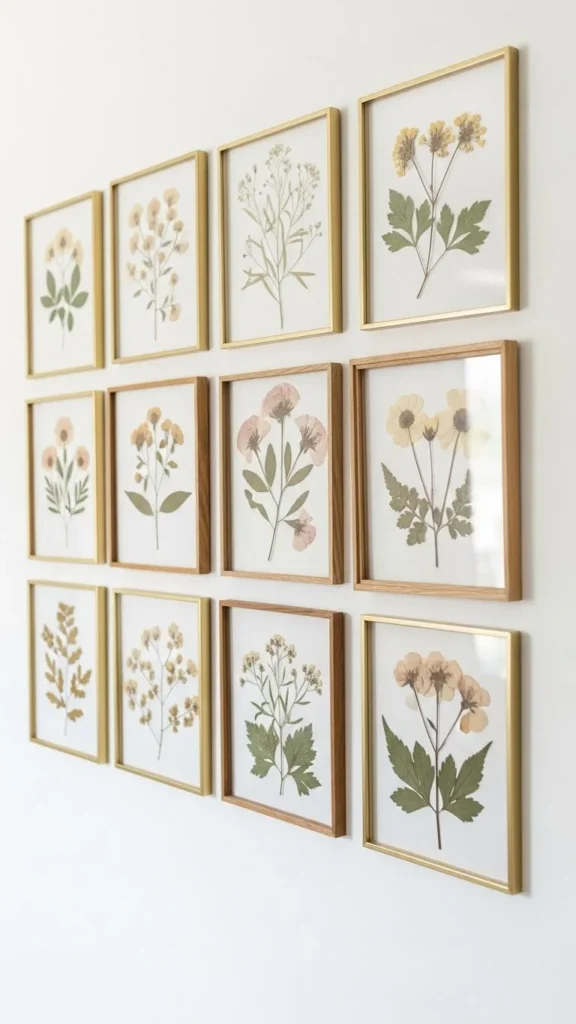 This works well in hallways or small walls. Stick to neutral frame colors so the flowers remain the focus. For variation, mix botanical labels or handmade paper backgrounds. Avoid dark backings; light paper keeps things airy.