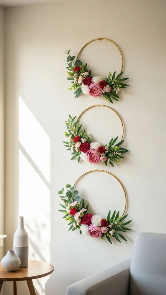 Floral hoops feel modern and playful. Use embroidery hoops or metal rings. Decorate only part of each hoop to keep things light. Full circles can look heavy on walls. Vary sizes for visual rhythm.