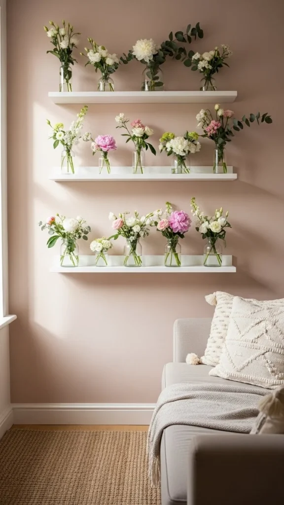 Wall shelves with flowers add dimension without heavy installs. Use lightweight floating shelves. Place small vases with faux or dried flowers. Vary heights to avoid a stiff look. Keep colors within one palette for harmony.