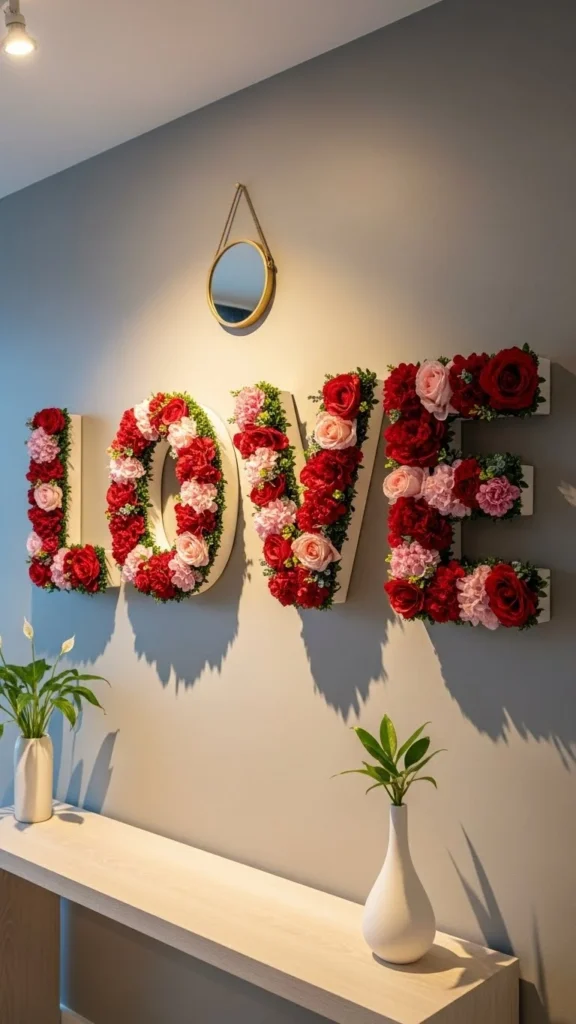 Floral letters feel personal and fun. Use cardboard or wood letters as a base. Glue flowers tightly for a full look. Choose one word only to keep visuals clean. LOVE works well and stays classic.