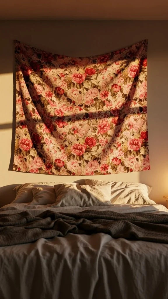 Fabric floral tapestries offer softness and warmth. Choose lightweight cotton or linen prints. Hang using a wooden dowel or clips. Avoid glossy fabric since it reflects light unevenly.