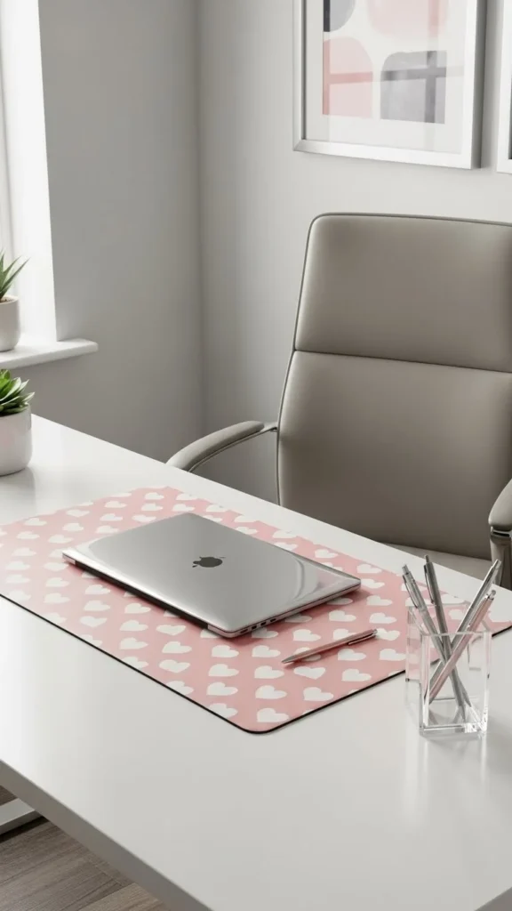A simple desk mat sets the tone for Valentine’s Day without overwhelming your workspace. Choose blush pink or soft red if you want subtle charm. This idea works well for shared or private desks because it’s compact and easy to remove later. Look for PU leather or washable fabric so spills don’t ruin it. Combine it with neutral stationery to keep the look balanced. Tape the edges if it curls. Add a microfiber cloth nearby so your surface stays spotless. A mat is an easy décor piece for small offices, cubicles, or home workstations. If you’re on a budget, try printing heart patterns on cardstock and layering it under a clear acrylic mat. It keeps the tabletop protected while adding a playful twist. This idea suits creative studios, reception desks, or even meeting tables where you want subtle Valentine character without going too bold. Tiny tweaks like matching pen holders or sticky notes keep the look cohesive.