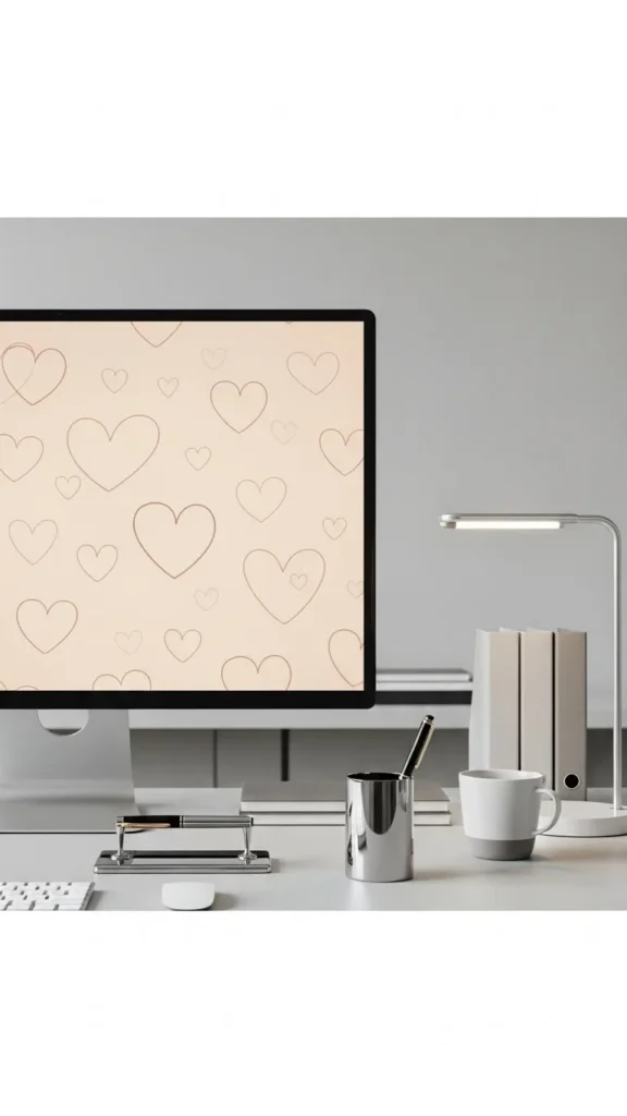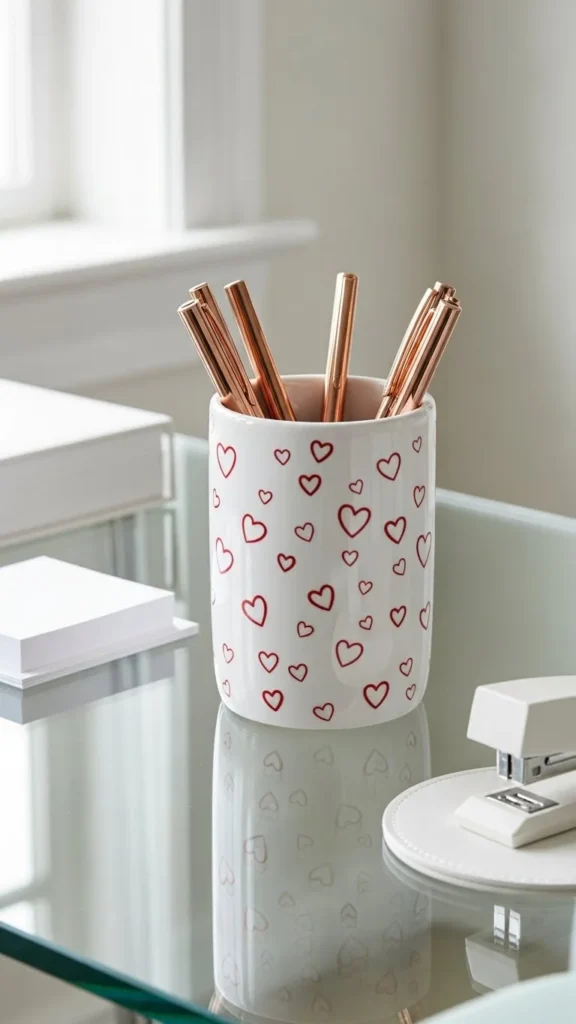 A pen holder is subtle but eye-catching. Ceramic feels clean and polished. Pair it with metallic pens for contrast. If you want something inexpensive, wrap an old jar with printed heart paper or fabric. Add ribbon for texture. The idea works for minimalist offices as well, because the pattern stays contained in a tiny area. Keep the holder filled so it looks intentional, not sparse. This décor blends function and style. It also adds a soft pop of color to neutral desks. You can coordinate it with binders or desk calendars for consistency. If you enjoy crafting, paint simple heart shapes using acrylic markers. Add a clear seal to prevent smudges. It’s a practical feature that feels seasonal and tidy.