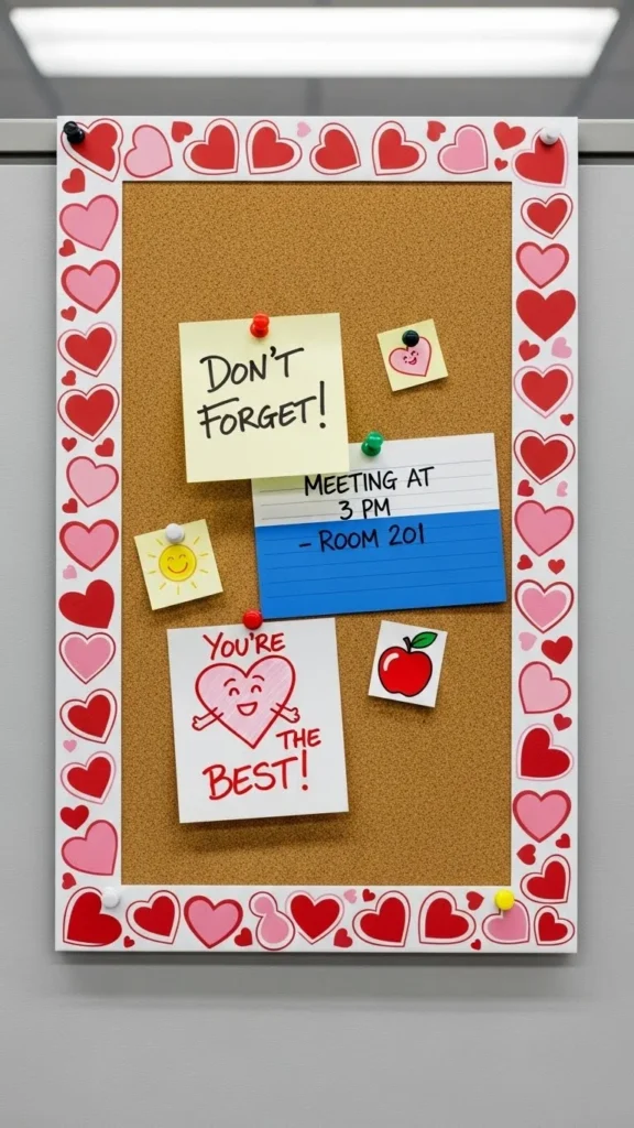 Bulletin boards offer space for décor and communication. Add heart borders. Use themed push pins. Create sections for tasks or uplifting messages. For a low-cost version, tape borders instead. This décor helps keep notes visible. It suits planning-focused roles. Swap themed borders later. It keeps the office functional and visually pleasant.