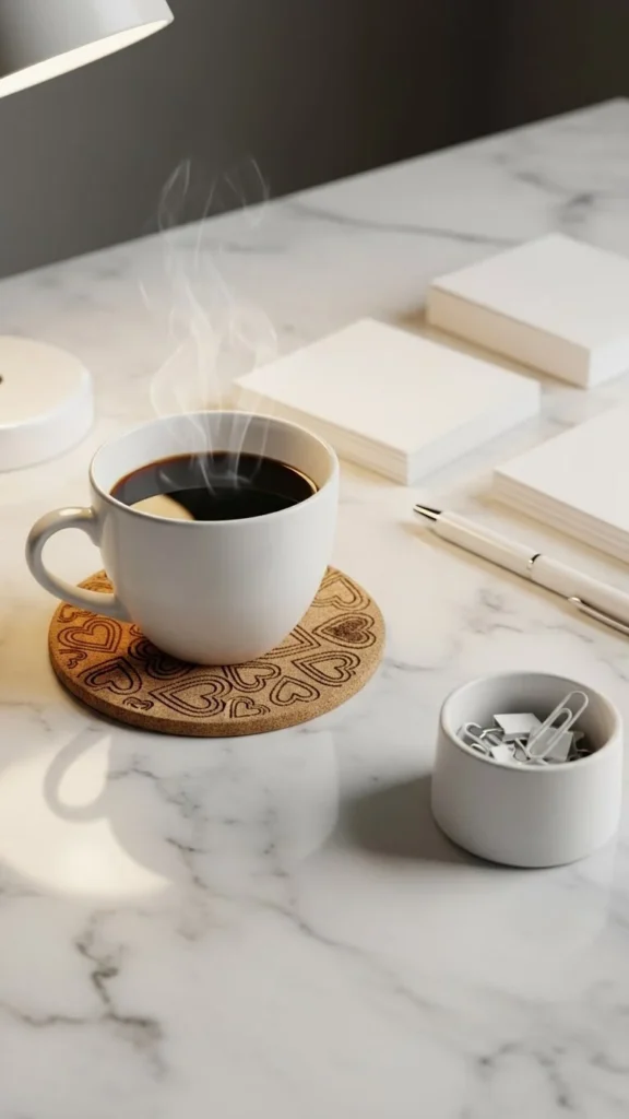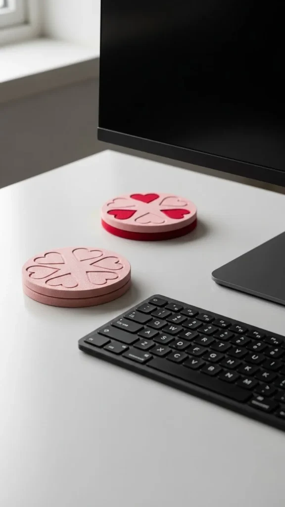 A coaster set brings tiny hints of themed décor while keeping surfaces tidy. Pick subtle patterns so they don’t distract. If you want a thrifty approach, cut circles from cork sheets and stencil miniature hearts. Pair them with a white tray for neat storage. This idea fits shared desks or meeting tables where spills are common. Keep the color palette calm so the space still feels professional. Stack extras in the break room for guest mugs. Rotate them after the holiday and store them flat. The compact size keeps the area free from bulky objects. If you want cohesion, match coaster shades with a desk mat or mug. A simple set adds charm without clutter and blends easily into any office style. This décor is functional and brings quiet Valentine character to everyday routines.