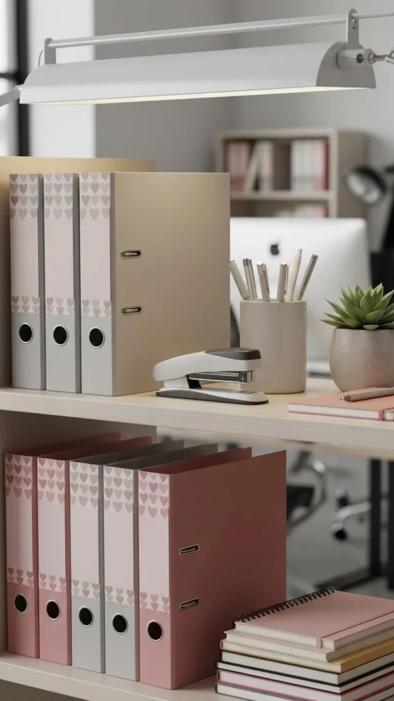 Binders often sit in plain sight, so themed covers make a noticeable difference. Use printable spine inserts with heart icons or blush borders. If you’re saving money, reuse clear binders and slide printed covers inside. Keep the colors subtle so they look professional. Label the spines clearly to maintain order. This works well for reception areas, meeting rooms, or project shelves. You can coordinate binder colors with sticky notes or calendars. Rotate covers after the season and keep them for next year. If you manage client files, themed labels help brighten the shelf without distracting from organization. This décor stays neat, practical, and reversible. When paired with matching clips or pens, the look becomes cohesive without overhauling the workspace.