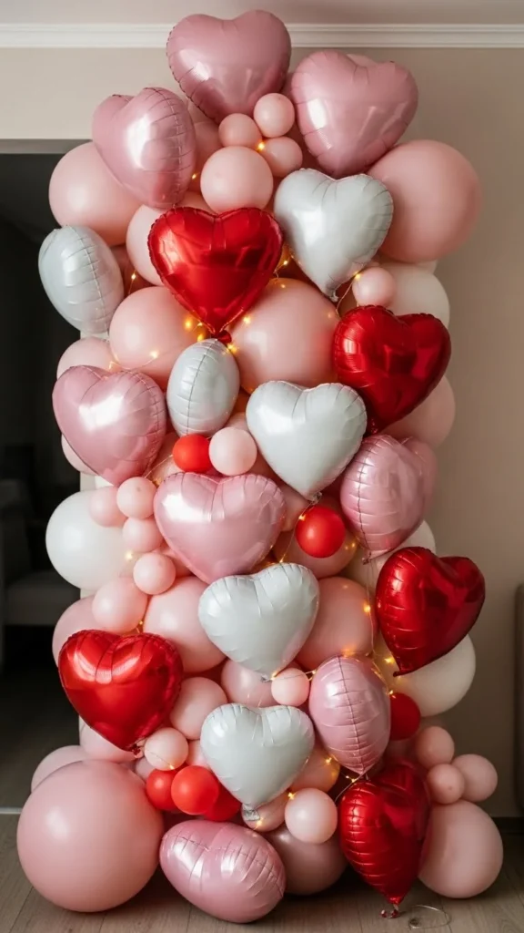 A heart balloon wall sets the tone the moment someone steps into the frame. It works well for parties, couples shoots, or kids’ Valentine photos. Stick to two or three shades to keep the look clean. Mixing matte and satin balloons adds gentle contrast without clutter. Use removable hooks or balloon strip tape so walls stay safe. For tighter budgets, shrink the design into a half-arch or side cluster. That still frames faces nicely. Warm string lights woven through the balloons help avoid flat shadows. Keep spacing loose so the wall feels airy, not packed. Color consistency matters more than size here. If balloons feel tricky, pre-made garlands save time. Place the backdrop near a window for daytime shoots. At night, add a floor lamp angled sideways for soft highlights. Keep outfits simple so the backdrop stays the hero.