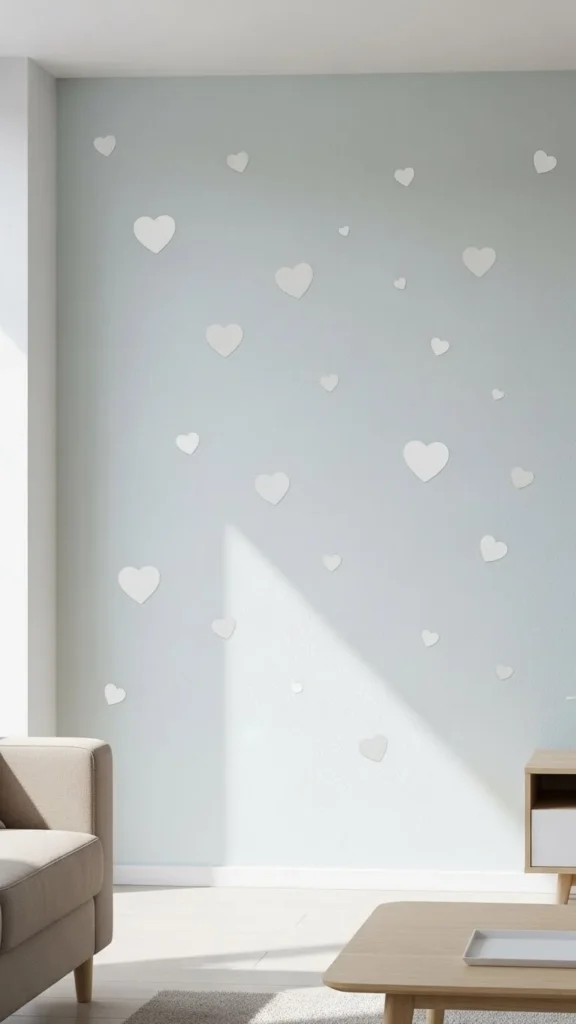 Wall decals work well for rentals. Scatter hearts loosely. Keep colors limited. Less decoration keeps focus on faces. Peel off after use without marks.
