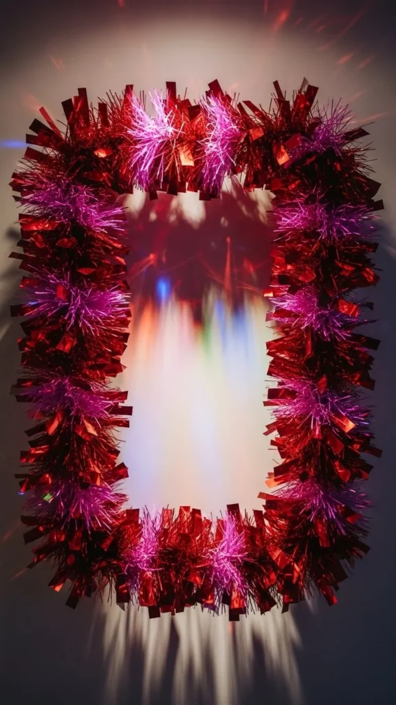 Tinsel frames outline photos nicely. Keep the center empty. Shine draws the eye. This works for quick party snaps. Store garlands coiled.
