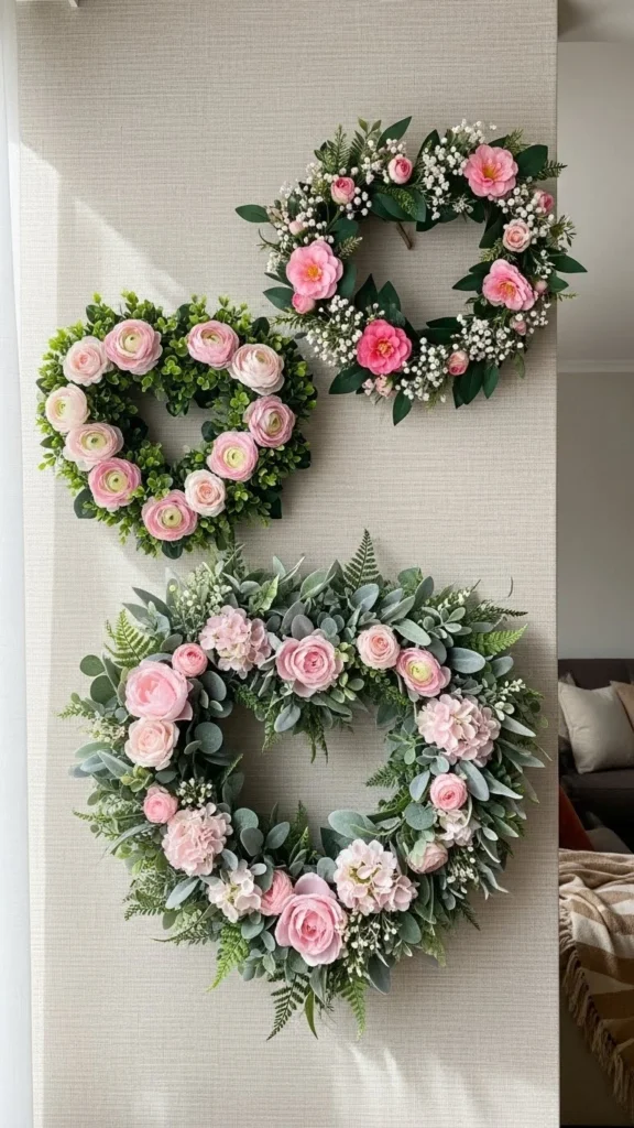 Heart wreaths feel soft and balanced. Hang three or five for symmetry. Natural textures calm the scene. Works year after year. Store in boxes to protect shape.
