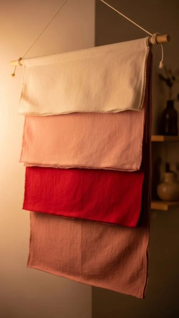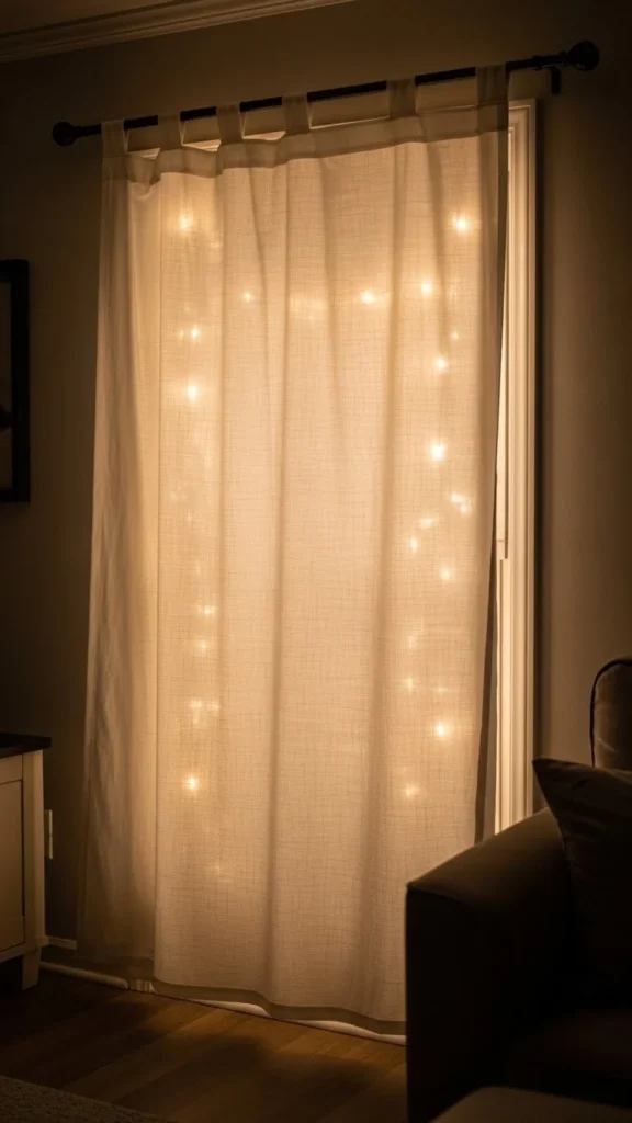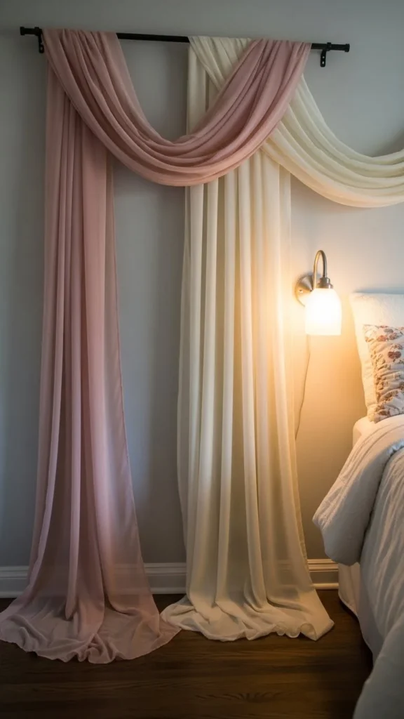 Sheer fabric creates movement even in still photos. Chiffon or voile works well and stays affordable by the yard. Hang panels loosely so folds fall naturally. Tight drapes look stiff on camera. Layer two shades for depth. Let fabric touch the floor for a relaxed feel. Soft folds add romance without extra props. Clip fairy lights behind the fabric for glow without harsh glare. This setup works great behind a bed, couch, or small table. If ceiling hooks aren’t allowed, use a tension rod or garment rack. Steam fabric first to remove creases. For storage, fold neatly and reuse for weddings or birthdays. Side lighting keeps faces well-lit while highlighting texture.
