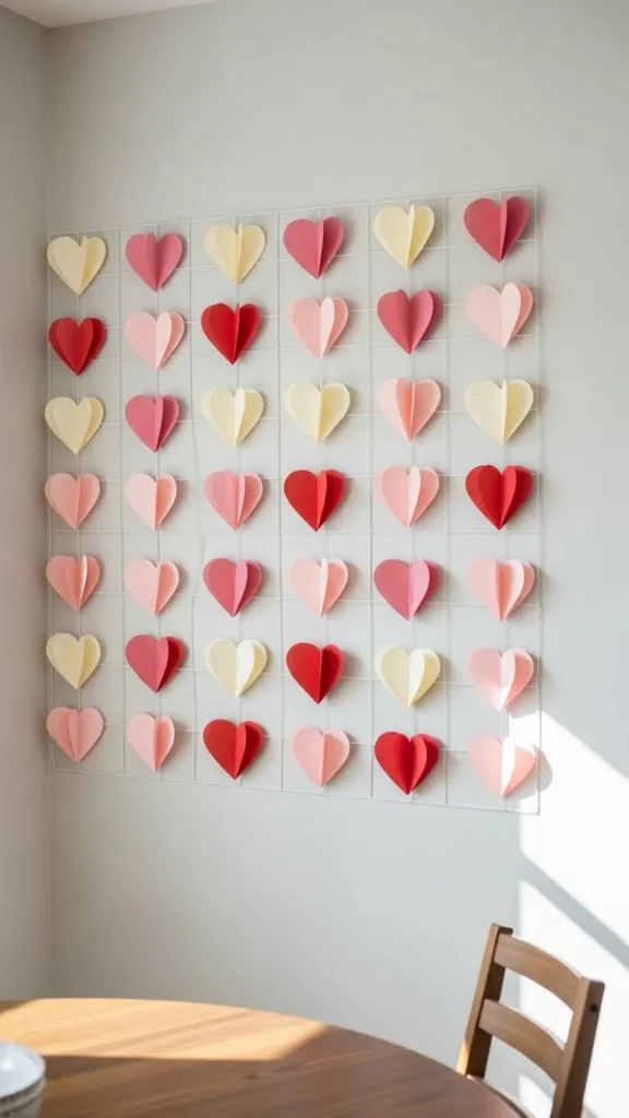 Paper fans add structure and rhythm. Mix fan sizes for depth. Arrange them into a loose heart rather than a perfect outline. This keeps it playful. Layering creates interest without clutter. Use lightweight paper for easy mounting. This backdrop works well behind dessert tables. Store fans folded for reuse at birthdays.