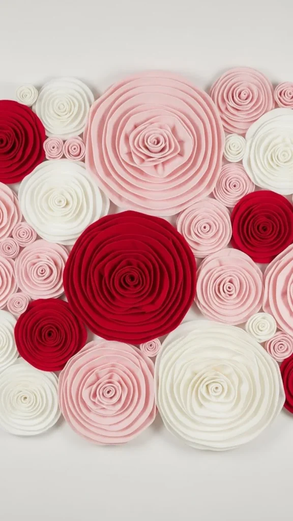 Fabric rosettes add dimension and softness. Mix sizes to avoid repetition. Space them loosely so the wall still breathes. Layered circles add depth without sharp edges. Felt holds shape well and cuts cleanly. This backdrop suits close-up portraits and dessert table photos. Attach rosettes with removable hooks. Store them in boxes to keep shapes intact.