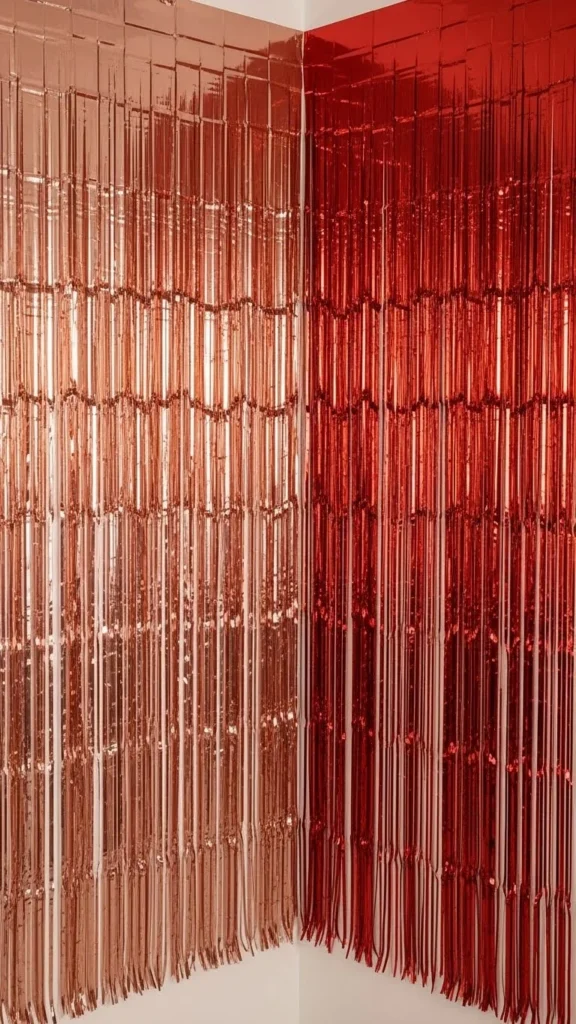 Fringe curtains scream celebration and love camera flashes. Layer two colors for dimension. Metallic foil reflects light fast, so avoid strong front lighting. Angle lights from the side to reduce glare. Tape curtains flat so they don’t bunch. Shimmer adds instant drama without extra decor. This backdrop works best for quick snaps and group photos. If foil feels loud, mix in a matte tissue fringe layer. Use command hooks for easy setup. Trim the bottom evenly for a clean frame. Outfits with solid colors are photographed best here. Store fringe rolled, not folded, to avoid creases.