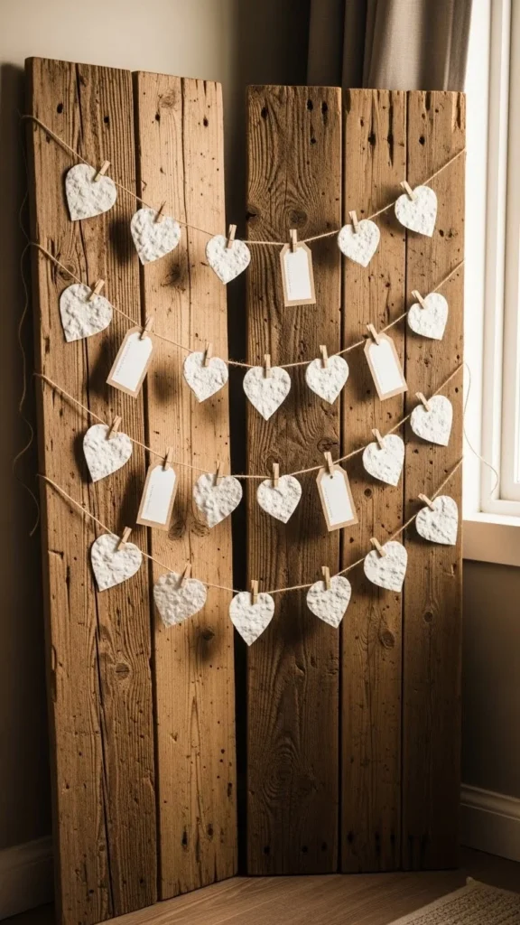Wood backdrops bring warmth and character. Use pallet boards or faux wood panels for lighter weight. Hang heart garlands at different heights. Avoid straight lines for a relaxed look. Twine and kraft paper keep costs low. Texture does the heavy lifting here. This setup works well for farmhouse-style homes. Add a small stool or crate for posing. Keep lighting soft to highlight grain without harsh shadows. If space is tight, use a single vertical wood panel as a side frame. Store panels flat for reuse.