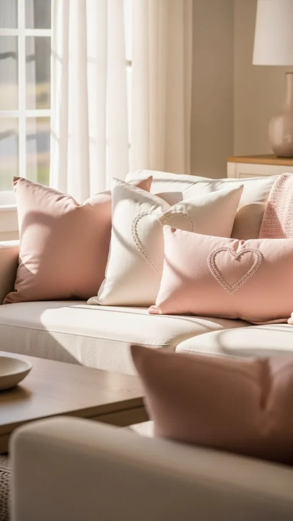 Blush pillows bring gentle romance without overpowering a room. Mix textures instead of patterns to keep the look calm. Velvet adds softness, while cotton keeps things casual. Stick to odd numbers for styling. Three pillows feel relaxed. Five feel plush. If you’re on a budget, swap covers instead of buying inserts. Tie small ribbon bows on corners for a Valentine touch. For balance, ground the pink with ivory or light oak furniture. Keep the surrounding decor simple so the color feels airy, not sugary.