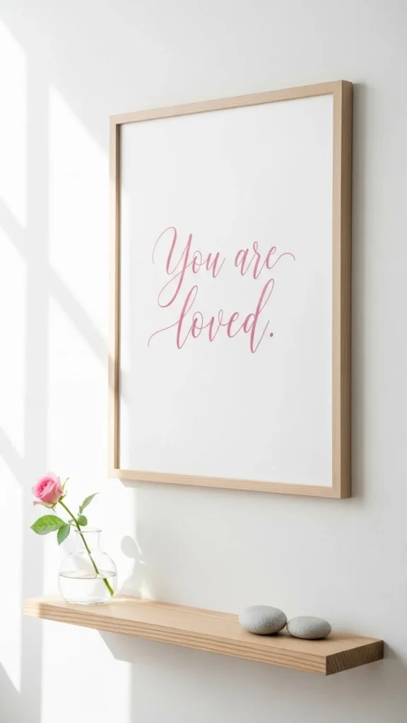 Printed quotes add personality without heavy decor. Use pastel ink on white paper for a calm look. Frames from dollar stores work well. Lean frames on shelves for casual styling. Gentle messaging keeps it tasteful.