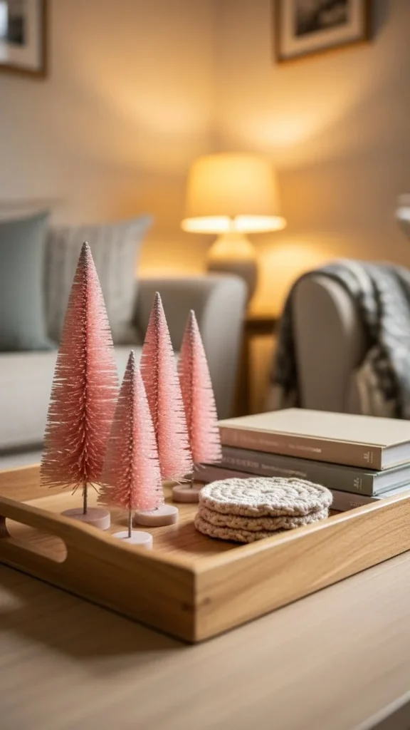 Mini trees aren’t just for winter. Choose soft pink shades and minimal sparkle. Cluster with candles for balance. Store them easily after the season. Playful detail adds charm fast.