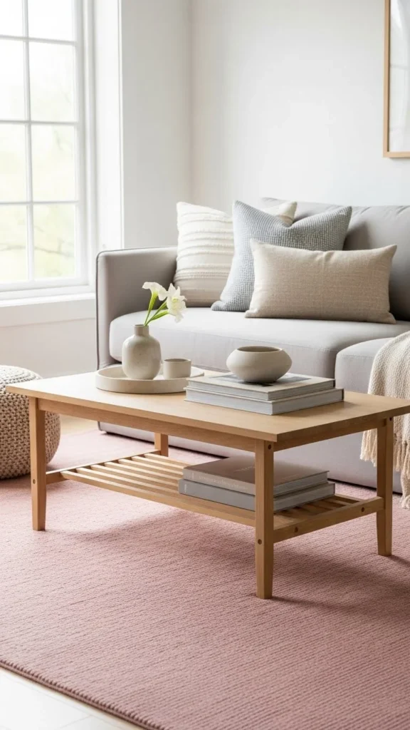 A pink rug anchors the room gently. Low-pile styles are easier to clean. Layer over jute for texture. Keep surrounding furniture light to avoid heaviness. Soft grounding works well in living spaces.