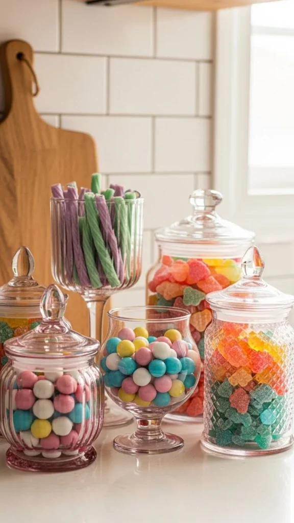 Candy jars double as decor and treats. Stick to one color family for calm visuals. Reuse jars year after year. Place near coffee stations for a sweet touch. Functional sweetness done right.