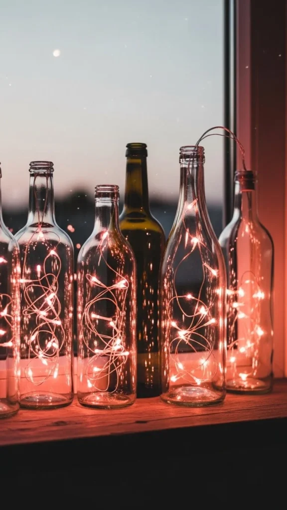 Light bottles create cozy corners instantly. Use battery packs hidden behind decor. Mix clear and pink glass. Group in odd numbers for balance. Warm sparkle without overload.