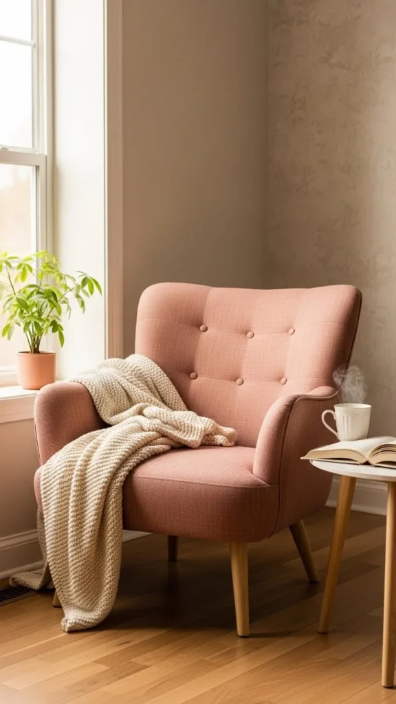 A pink chair becomes a statement piece. Keep the rest of the nook simple. Add a neutral throw for comfort. Thrifted chairs can be reupholstered cheaply. Soft focal point that lasts beyond February.