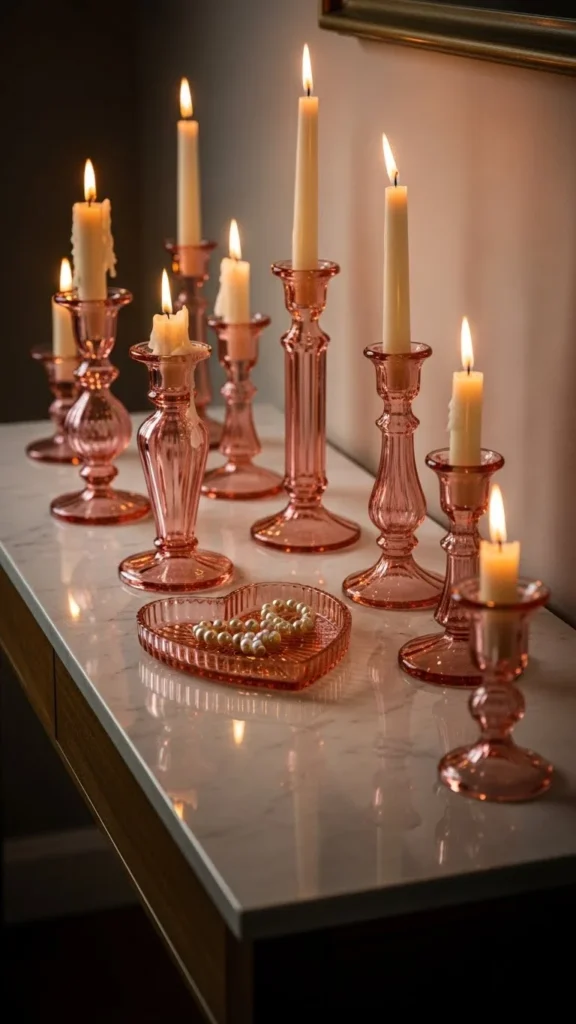 Pink glass catches light beautifully and creates soft romantic glow at night. Thrift stores often have mismatched pieces that look charming together. Group them in threes at varying heights. Use flameless candles for safety on shelves. A mirrored or marble tray underneath doubles the glow. Keep nearby decor neutral so the glass color stays the focus.