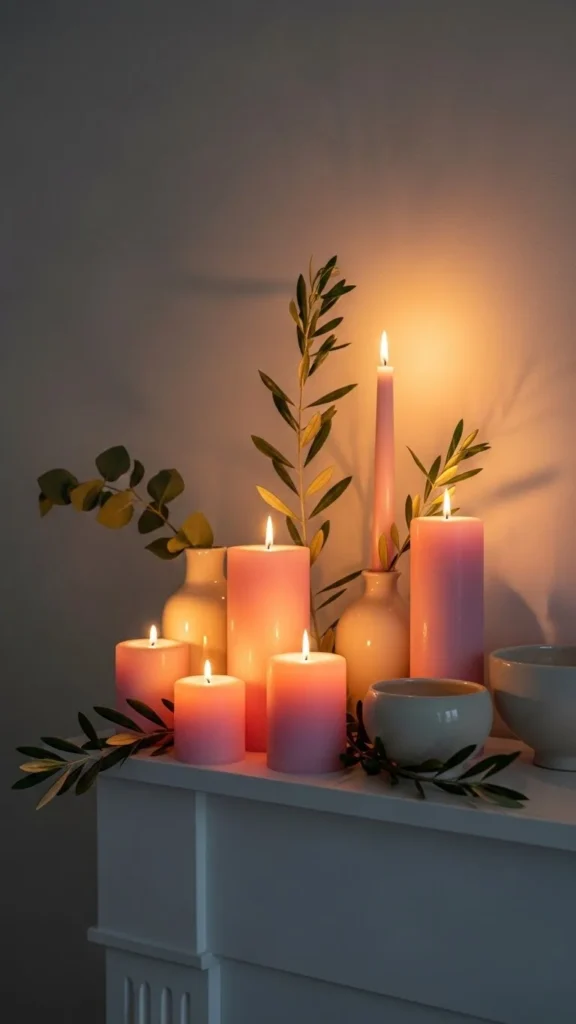 Mantel candles set a calm romantic tone without filling the space with extras. Choose unscented pillars so the look stays clean. Vary heights to keep the eye moving. Use ceramic or stone holders for contrast against the pink wax. If open flames feel risky, high-quality LED candles work well and still glow softly. Add one or two neutral objects like a small vase or framed art to break up the color. Soft candle layers make the mantel feel intentional, not crowded.