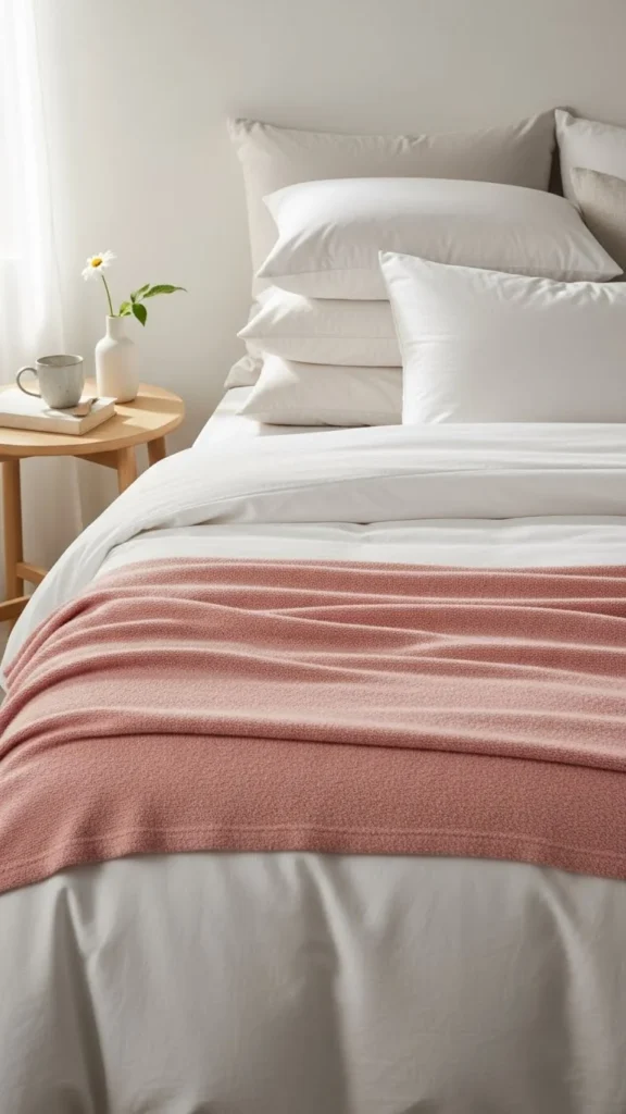 A single blush accent warms a bedroom instantly. Choose breathable fabrics to avoid shine. Drape instead of folding perfectly. If pink feels strong, balance with beige or gray pillows. Light layering keeps things restful.
