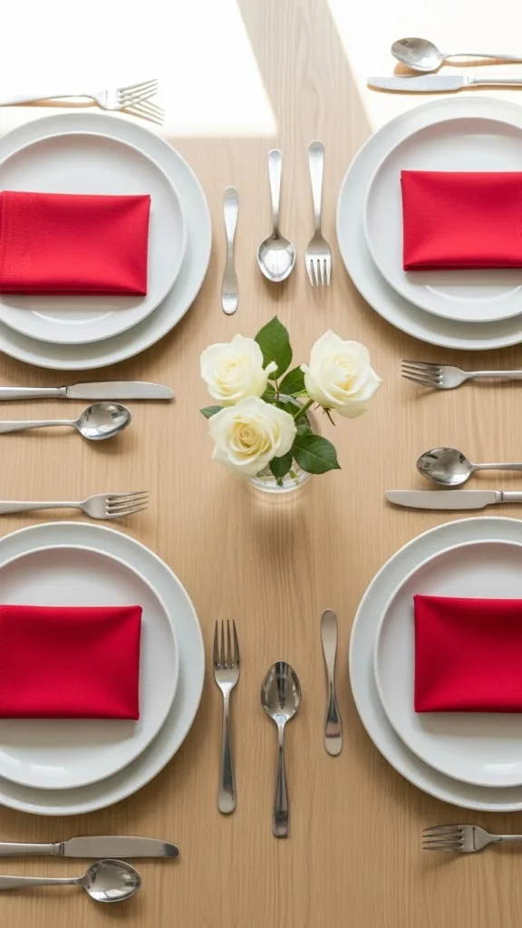 Red napkins instantly signal Valentine style. Fold them simply to keep things classic. Cloth napkins feel reusable and photograph well. Add name cards for a personal touch. This setup works for casual dinners or small gatherings.