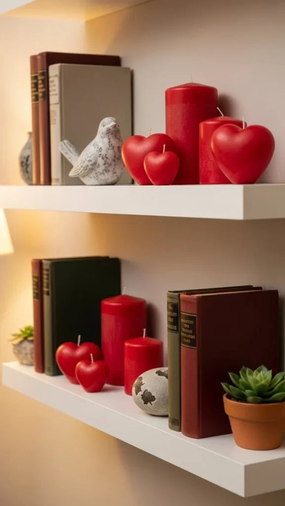 Heart candles add subtle theme cues. Keep them spaced out to avoid clutter. Use white shelves to highlight the color. Place them on trays or plates for safety. They work well in bedrooms and living areas.
