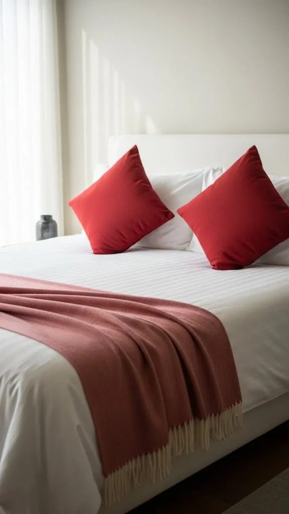 Bedding accents refresh the bedroom quickly. Stick to two or three red pieces only. White sheets keep balance and brightness. Use removable pillow covers to save storage space. This setup feels cozy without being overwhelming.