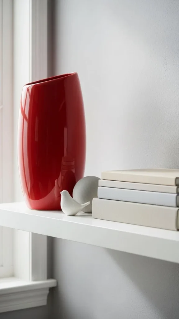 A single red vase creates a strong focal point. Keep surrounding items neutral. Odd-number groupings feel balanced. Thrift stores often carry unique ceramics at low cost.