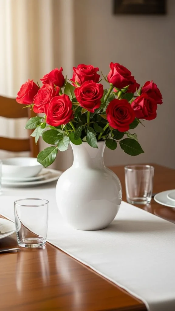 Red roses paired with white ceramics never lose their appeal. This setup works for dining tables, coffee tables, or entry consoles. Choose shorter stems for a relaxed feel. Real or faux roses both work depending on the budget. If using faux, lightly bend stems for a natural shape. Add greenery like eucalyptus for contrast. Keep the vase simple so the flowers remain the focus. For a casual touch, cluster three small vases instead of one large arrangement. This idea suits both modern and traditional homes.