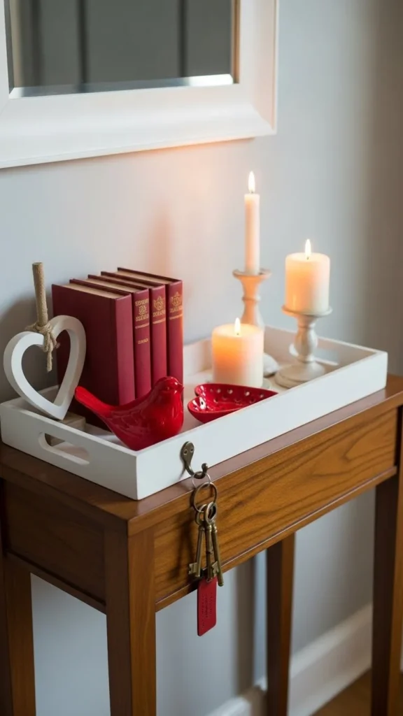 Entryways set the mood right away. Keep the tray simple. Limit decor to a few items for a tidy look. This setup feels welcoming and easy to refresh after February.