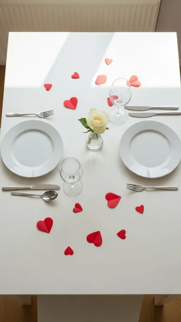Paper hearts offer an easy, low-cost detail. Cut them by hand or use a punch tool. Keep spacing light rather than dense. Less scatter looks cleaner and photographs better. This idea suits casual dinners or brunch setups. Gather and reuse the hearts for crafts later.