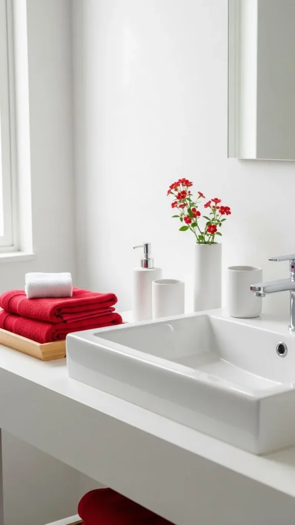 Bathrooms benefit from subtle seasonal touches. Red towels against white sinks feel cheerful. Choose plush cotton for comfort. Stick to one or two red pieces only. Add a small floral or candle for warmth. This keeps the space calm while still on theme.