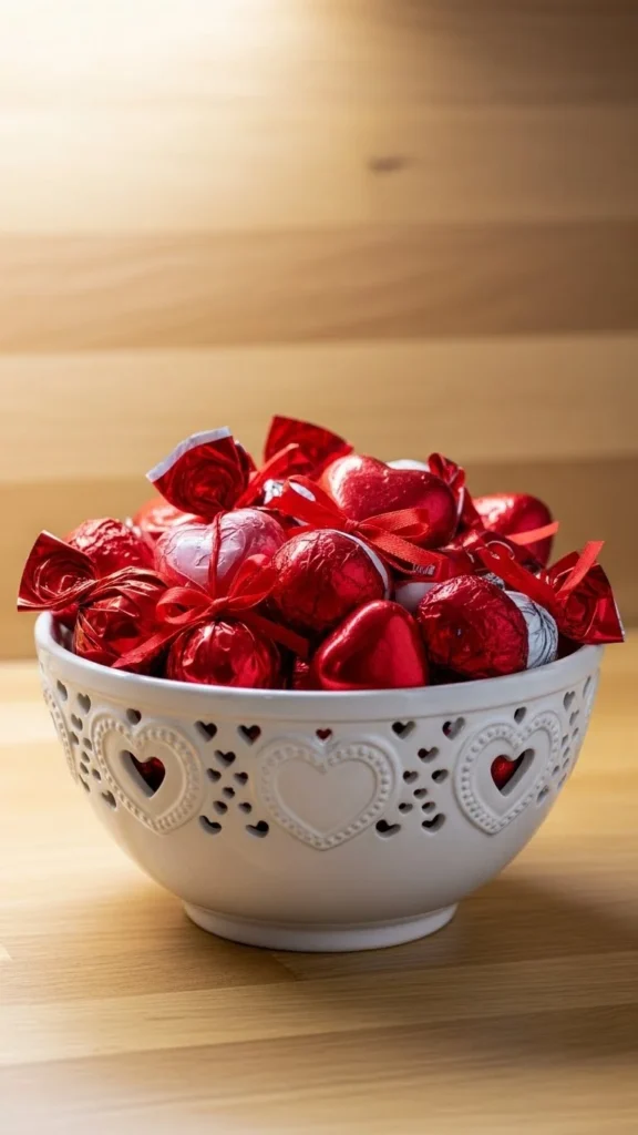 A gift bowl feels inviting and practical. Use wrapped chocolates or candies for easy sharing. Choose simple red packaging to keep the look tidy. Place it where people gather like kitchens or coffee stations. After the season, swap contents for snacks or fruit to reuse the bowl year-round.