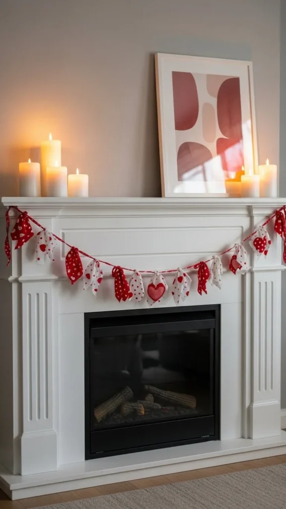 A red and white garland instantly draws attention to the mantel. Fabric or felt versions feel warm and handmade. DIY garlands save money and allow custom lengths. Mix hearts with simple circles for visual rhythm. Keep spacing loose rather than tight. Balance the look with white candles or framed prints. If you don’t have a fireplace, drape the garland over a shelf or window frame. This setup feels festive yet familiar.