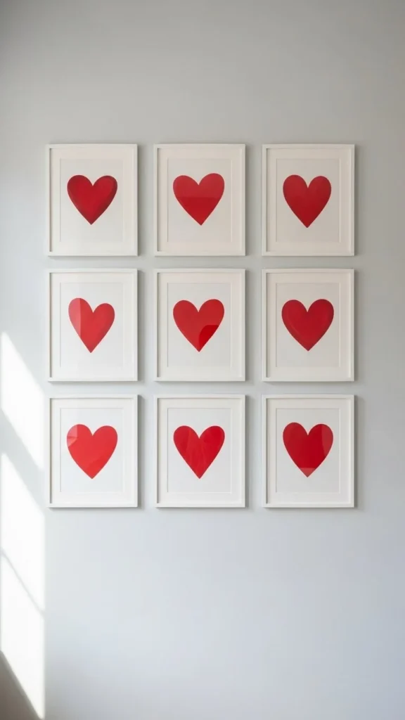 Simple heart artwork keeps things classic. White frames help the red pop without overpowering the wall. Print free designs at home for a budget-friendly option. Consistent frame sizes create a clean look. Keep spacing even. After Valentine’s Day, swap the prints for seasonal art using the same frames. This idea works well in hallways or bedrooms.
