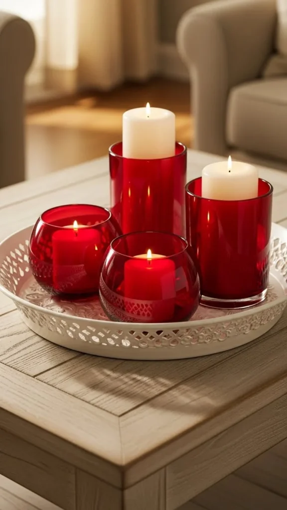 Candles create warmth without heavy decor. Red holders add color while white candles keep the look grounded. Group in odd numbers for visual balance. Thrift stores often have glass holders at low prices. Place the tray on coffee tables or sideboards. This arrangement suits evening dinners or quiet nights in.