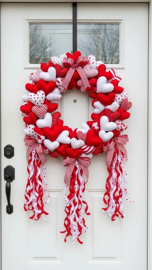 A wreath sets the tone right at the entrance. Fabric hearts feel soft and traditional. Use wire frames for easy shaping. Neutral ribbon tones keep the red from feeling too bold. Hang it indoors or outdoors. Store it flat to reuse next year.