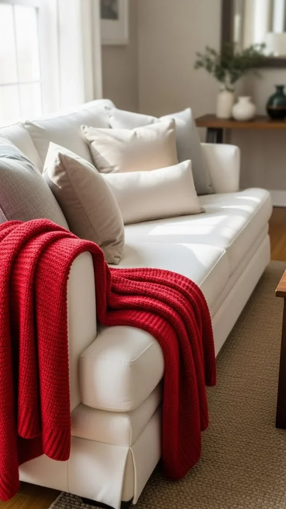 A red throw adds warmth without much effort. Knit or woven textures work best. Drape loosely rather than folding for a relaxed look. Budget tip: check end-of-season sales. This accent pairs well with white sofas and neutral rugs.