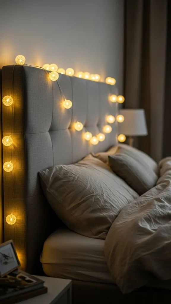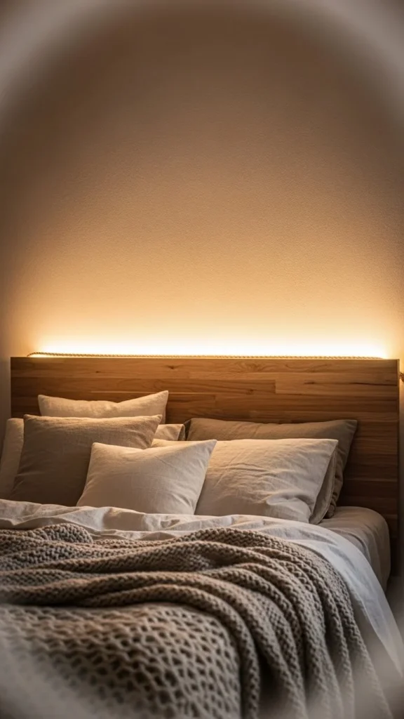 Hidden rope lights add glow without visible bulbs. Secure them along the back edge of the headboard. Choose a warm tone only. Indirect light feels soothing before sleep. This is renter-friendly and easy to remove. Keep brightness low. The wall glow adds depth without distraction.