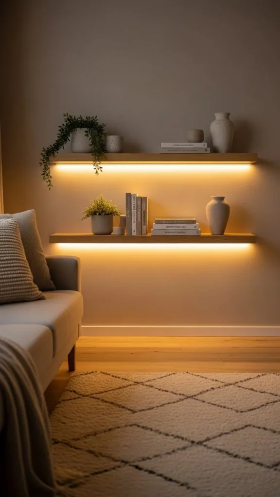 Hidden lighting adds glow without visible fixtures. Choose warm strips. Install with adhesive backing. Indirect light feels soothing.