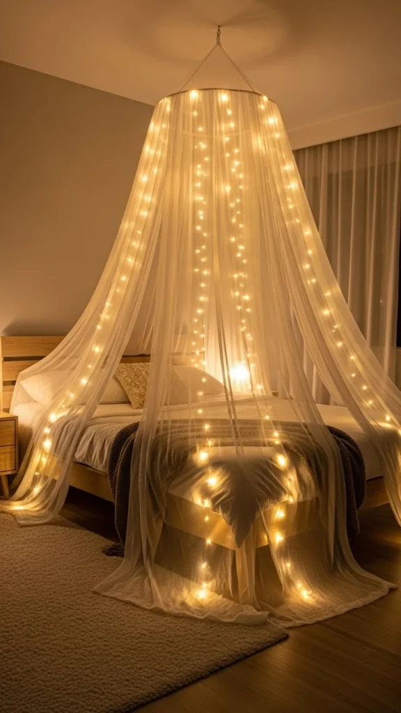 Drape lights loosely through fabric. Avoid tight wrapping. Layered light feels dreamy and relaxed.