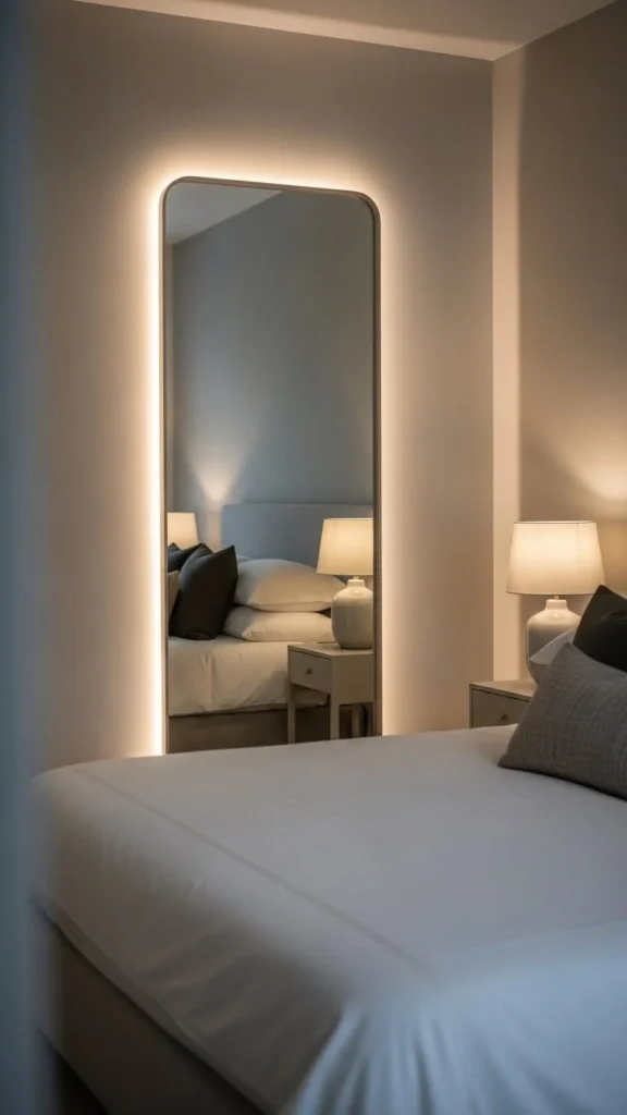 Backlit mirrors create glow without glare. Reflected light expands space gently.