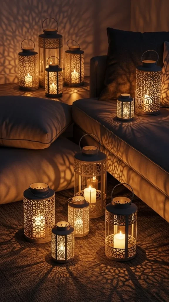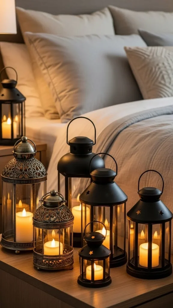 Lantern clusters work well on floors or low stools. Mix two or three sizes. Use LED candles for safety. Grouped light sources feel cozy rather than staged. This works well in bedrooms or living rooms. Move lanterns around as needed for flexible styling.