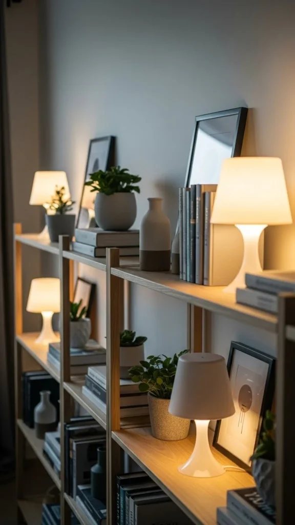 Shelf lamps create layers at eye level. Choose compact bases and linen shades. Layered lighting adds comfort without overpowering the room. Use timers so they turn on automatically in the evening. This feels welcoming and effortless.