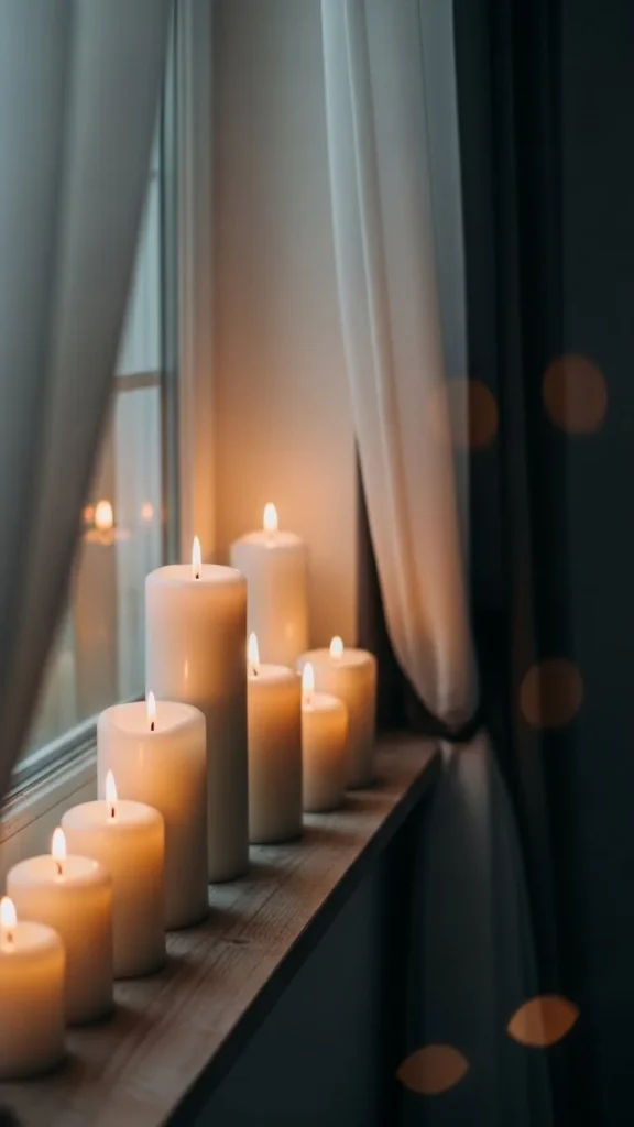Window sills are perfect for candle glow. Use different candle heights but similar colors. Place them close but not crowded. Flameless candles work well if safety is a concern. Gentle flicker adds romance without effort. At night, the reflection on glass doubles the effect. Keep the rest of the room dim for contrast.